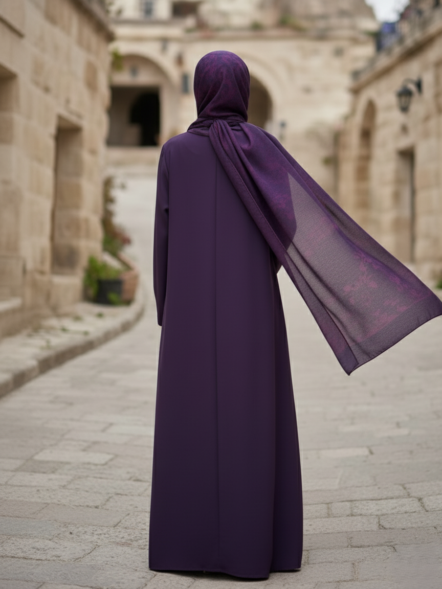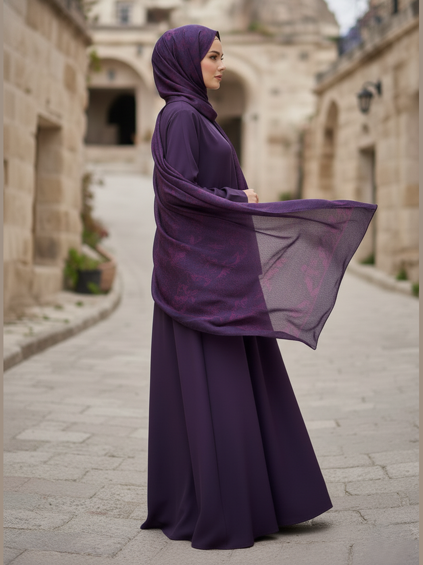 • Rich Color Palette: Deep plum abaya paired with a vibrant printed scarf for seamless coordination.