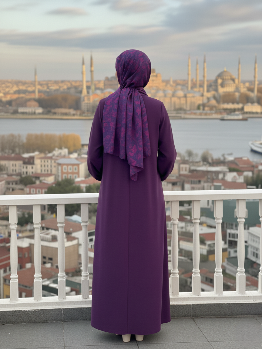 Bold yet graceful, Adeena captures the essence of timeless sophistication. Rendered in a rich plum-purple tone, this front-open abaya exudes depth and confidence, complemented by a patterned scarf in hues of violet and magenta — creating a perfect harmony between tradition and contemporary flair.