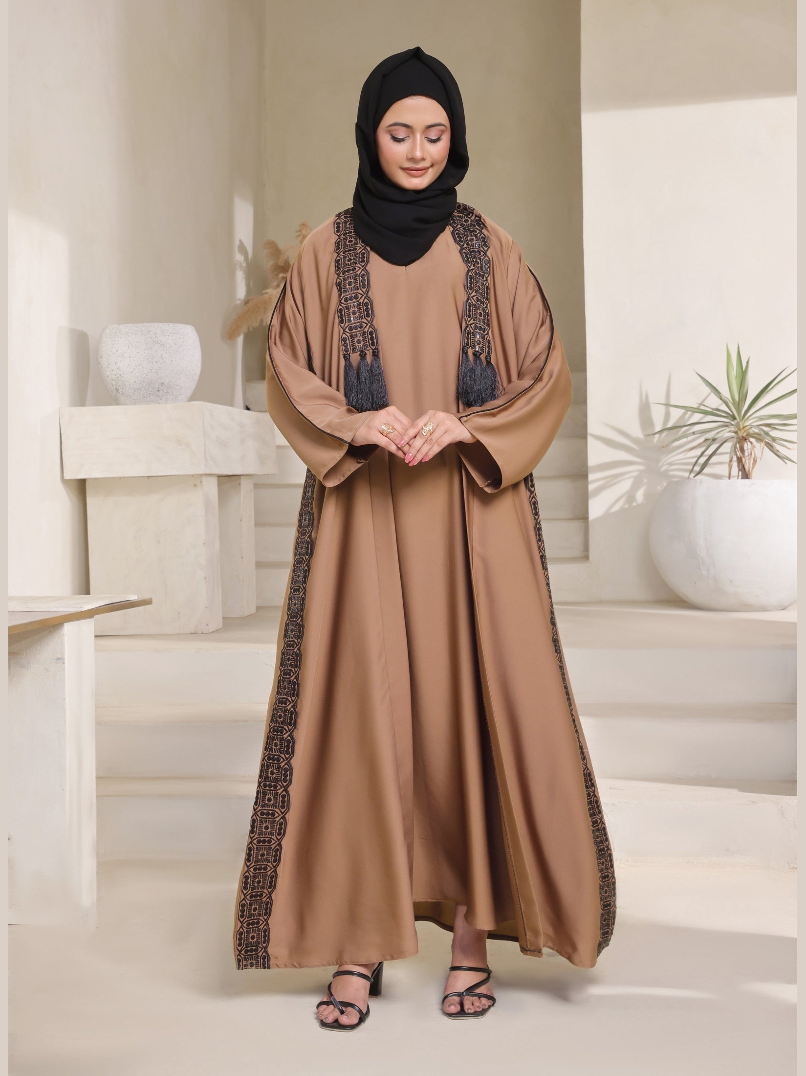 A statement of heritage and grace, our Desert Dusk Abaya blends classic charm with contemporary elegance. Crafted from soft Korean Nidha fabric in a warm camel-brown tone, this piece is elevated with rich embroidered panels and tassel accents for a timelessly sophisticated look.
