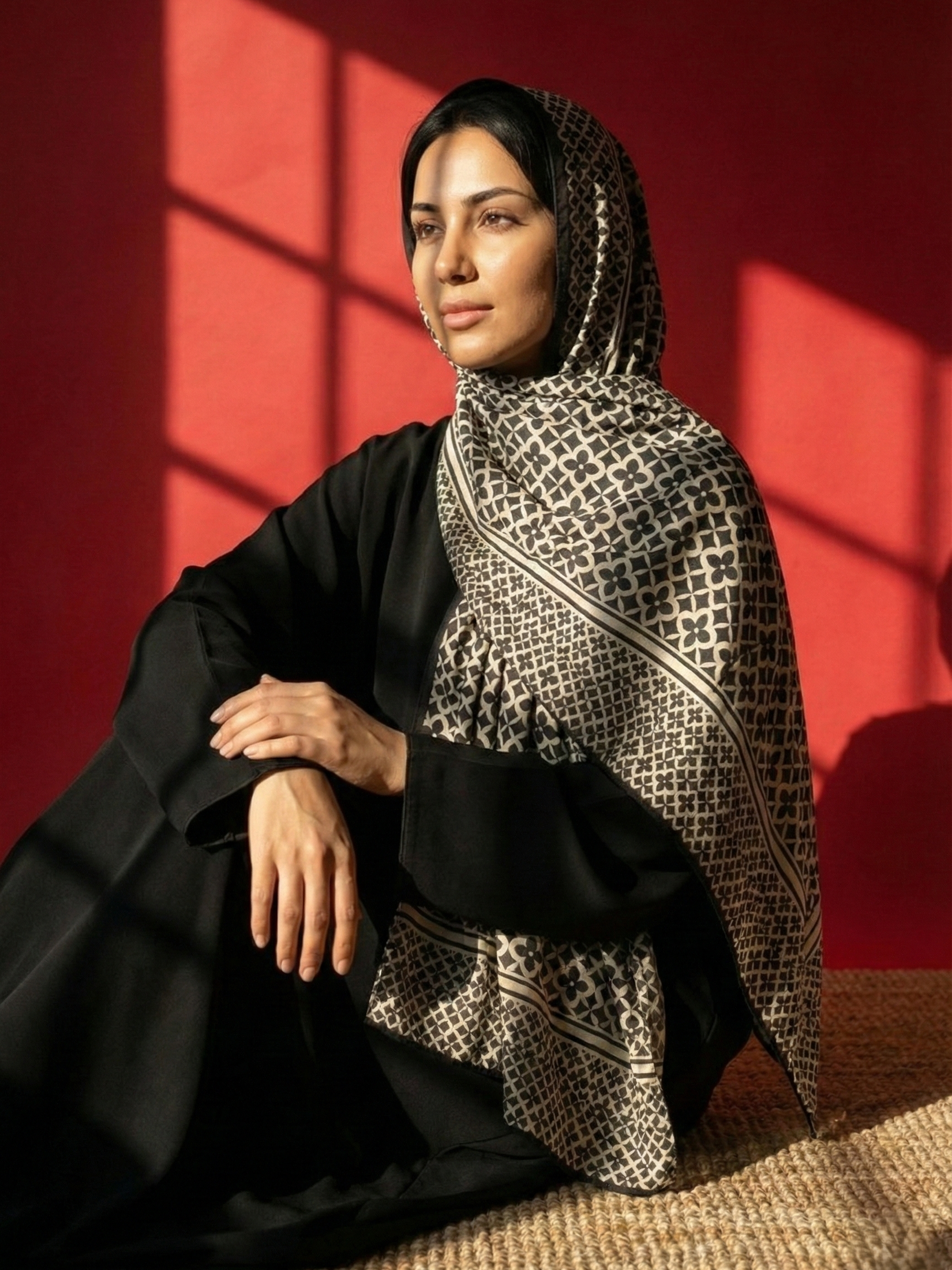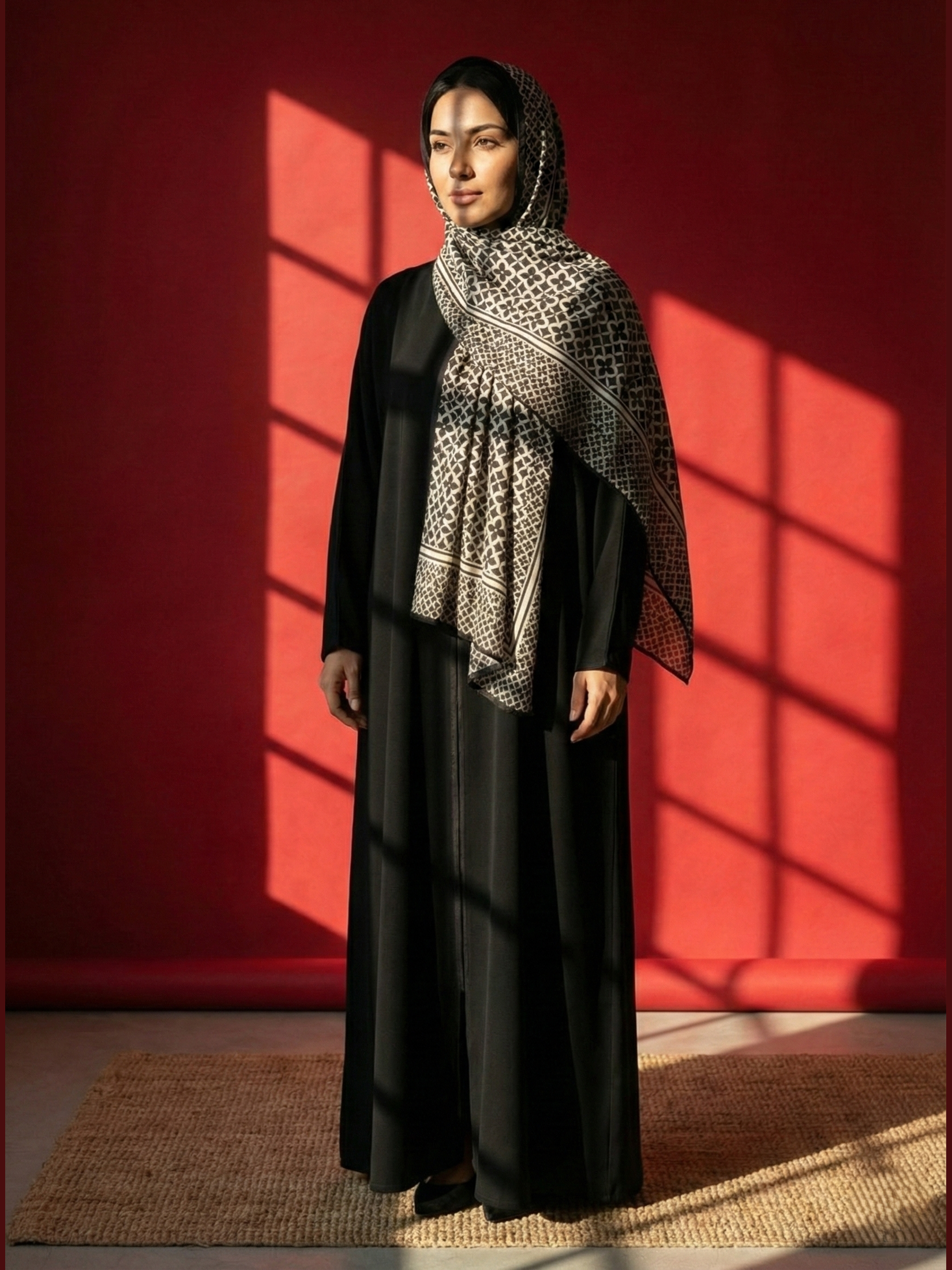 🖤 Statement Printed Hijab: Comes with a bold black-and-ivory geometric hijab that adds depth, contrast, and visual refinement.