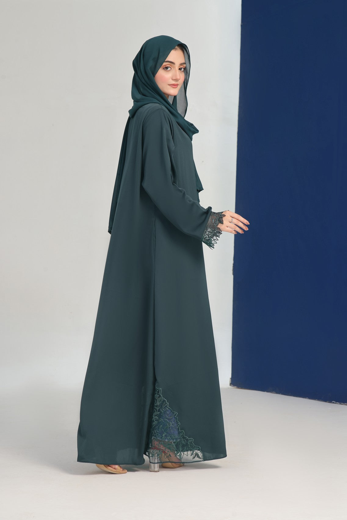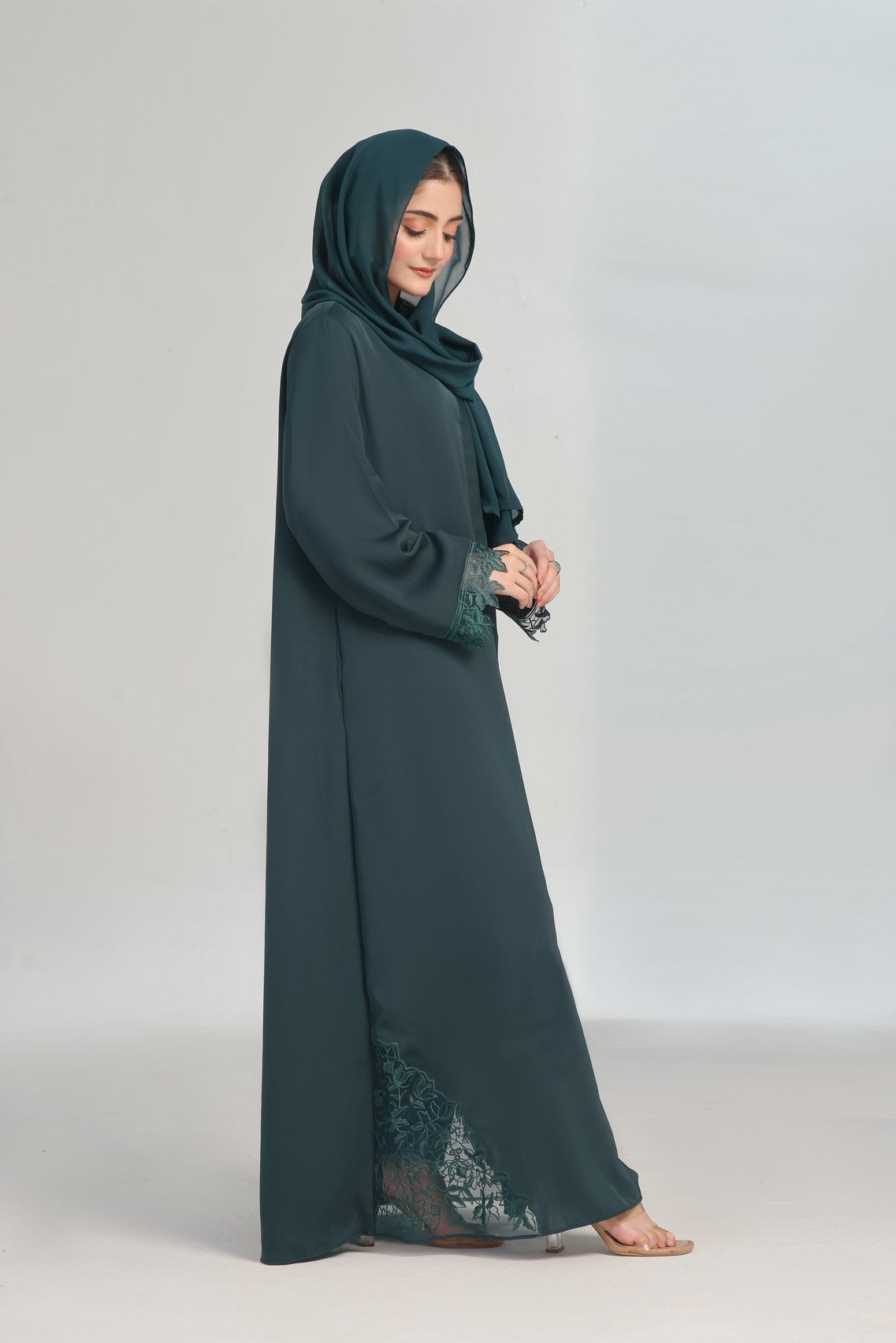 Organza Thread Work on Sleeves: Delicate and intricate embroidery on the sleeves enhances the abaya’s elegance.