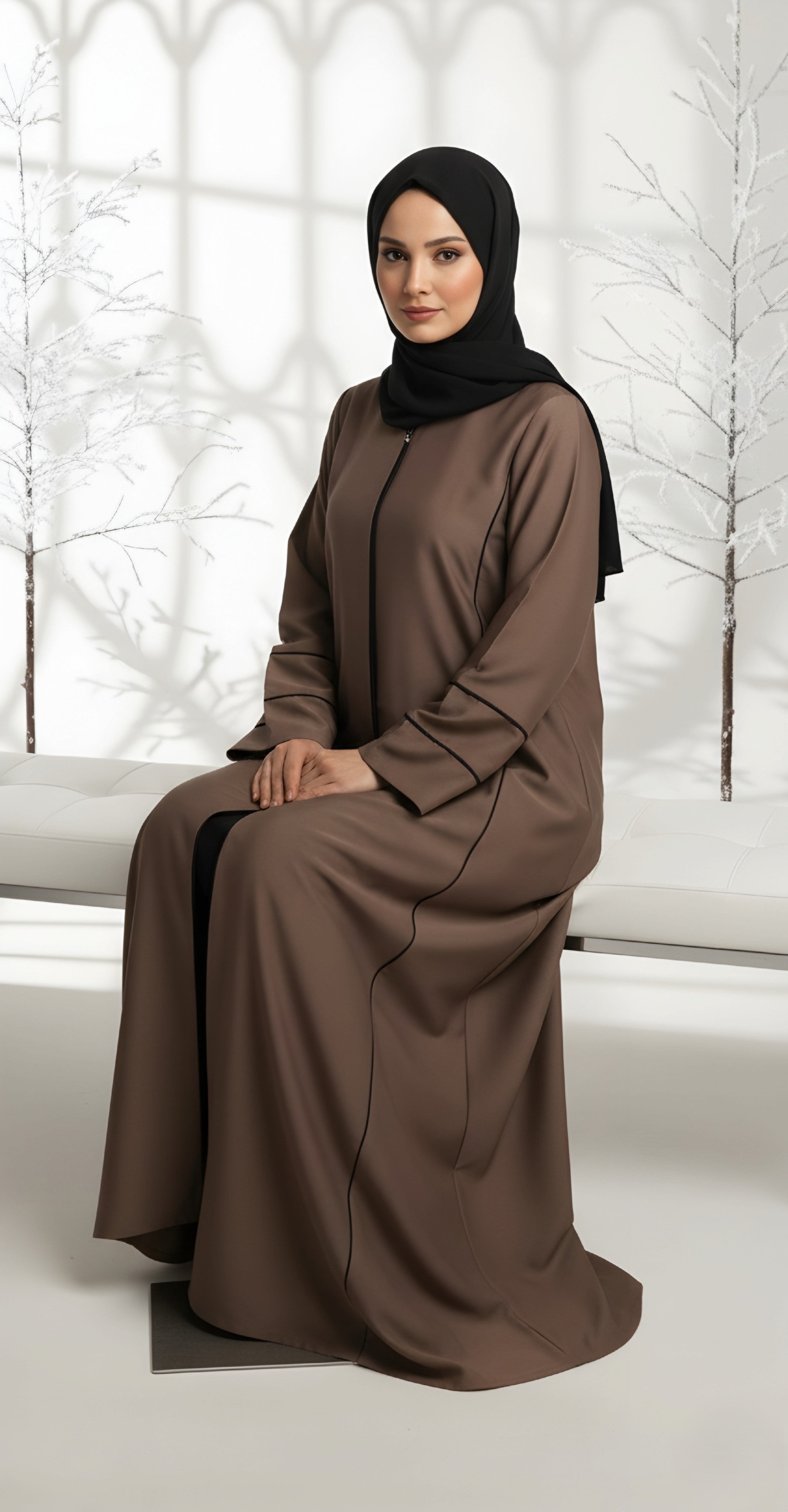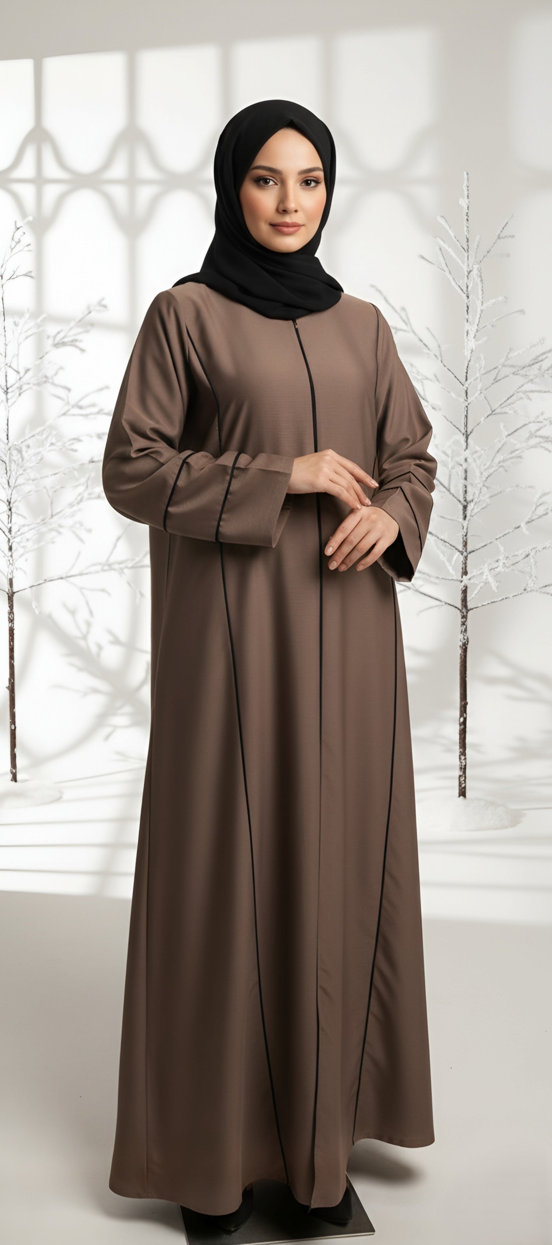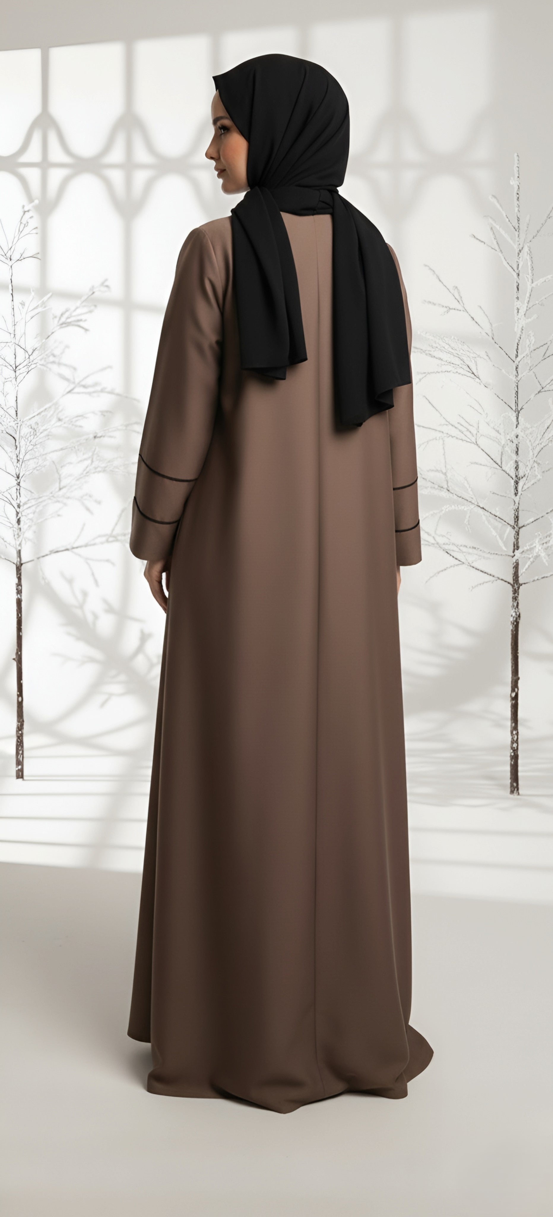 Understated luxury meets everyday elegance — Brown Buff is a front-open abaya crafted from premium Nidha fabric in a rich mocha hue. Its sleek black piping detail adds a modern edge to a timeless silhouette, making it ideal for both casual sophistication and refined gatherings.