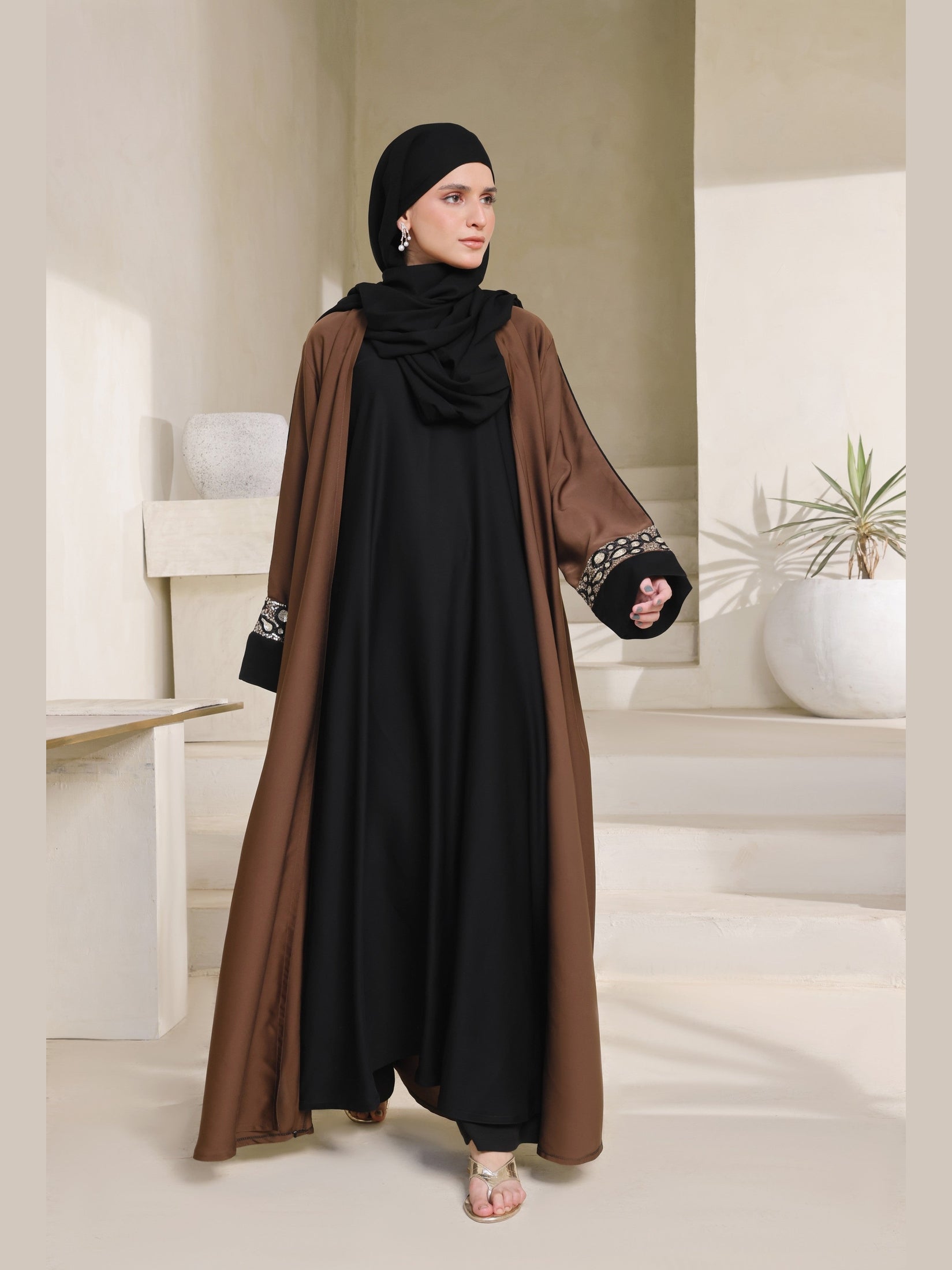 Elevate your modest wardrobe with this stunning Kimono-style abaya in a rich coffee brown hue, beautifully contrasted with a classic black base. The abaya is designed with intricate embroidered cuffs that add a touch of elegance and sophistication to its graceful silhouette.