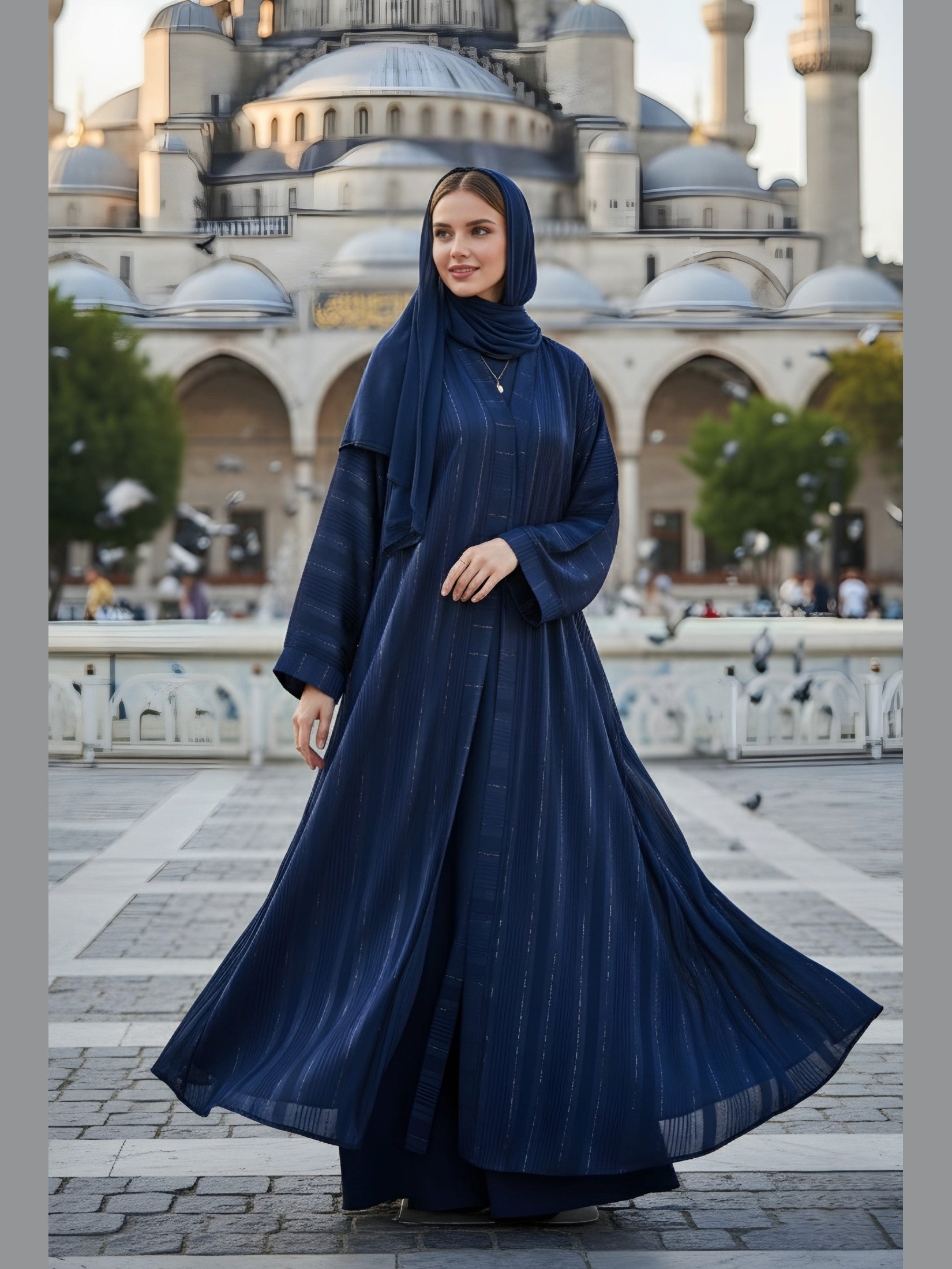 Elegant, versatile, and modestly refined — this Blue Zari-Line Front-Open Abaya is a must-have addition to your wardrobe.