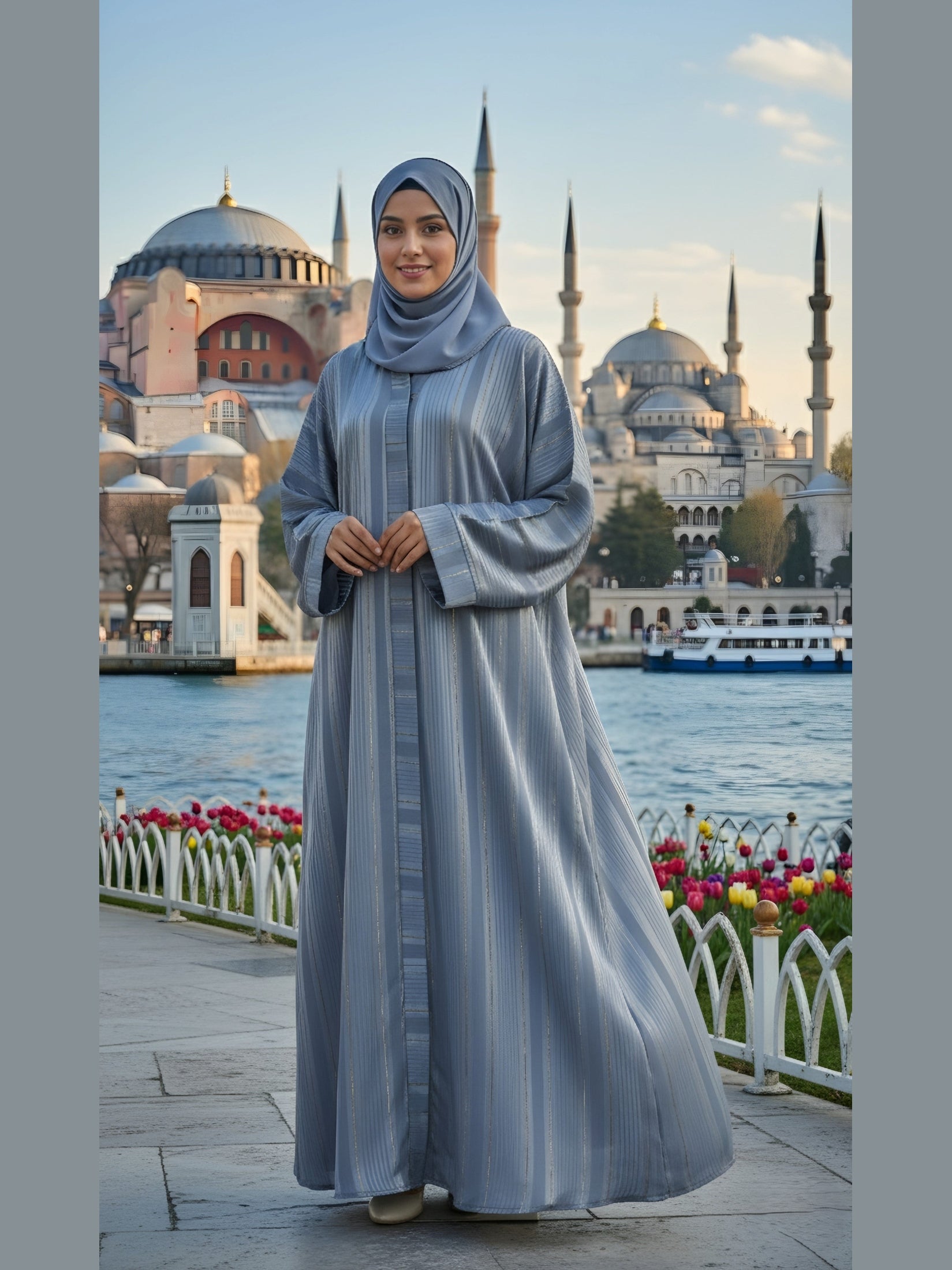 Refined, graceful, and endlessly versatile — this Grey Zari-Line Front-Open Abaya is the perfect balance of simplicity and sophistication.