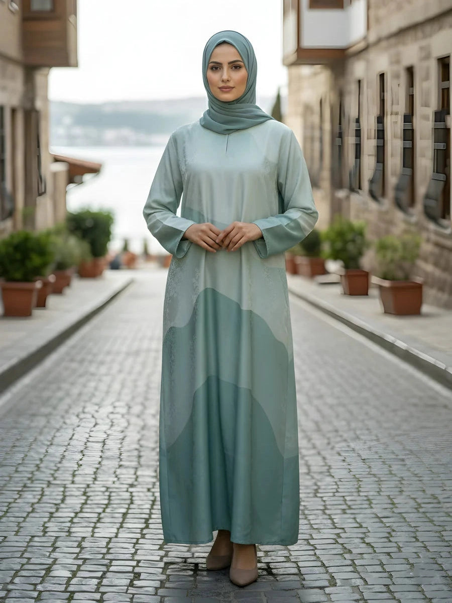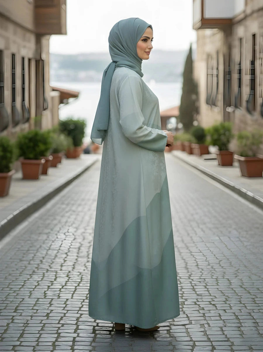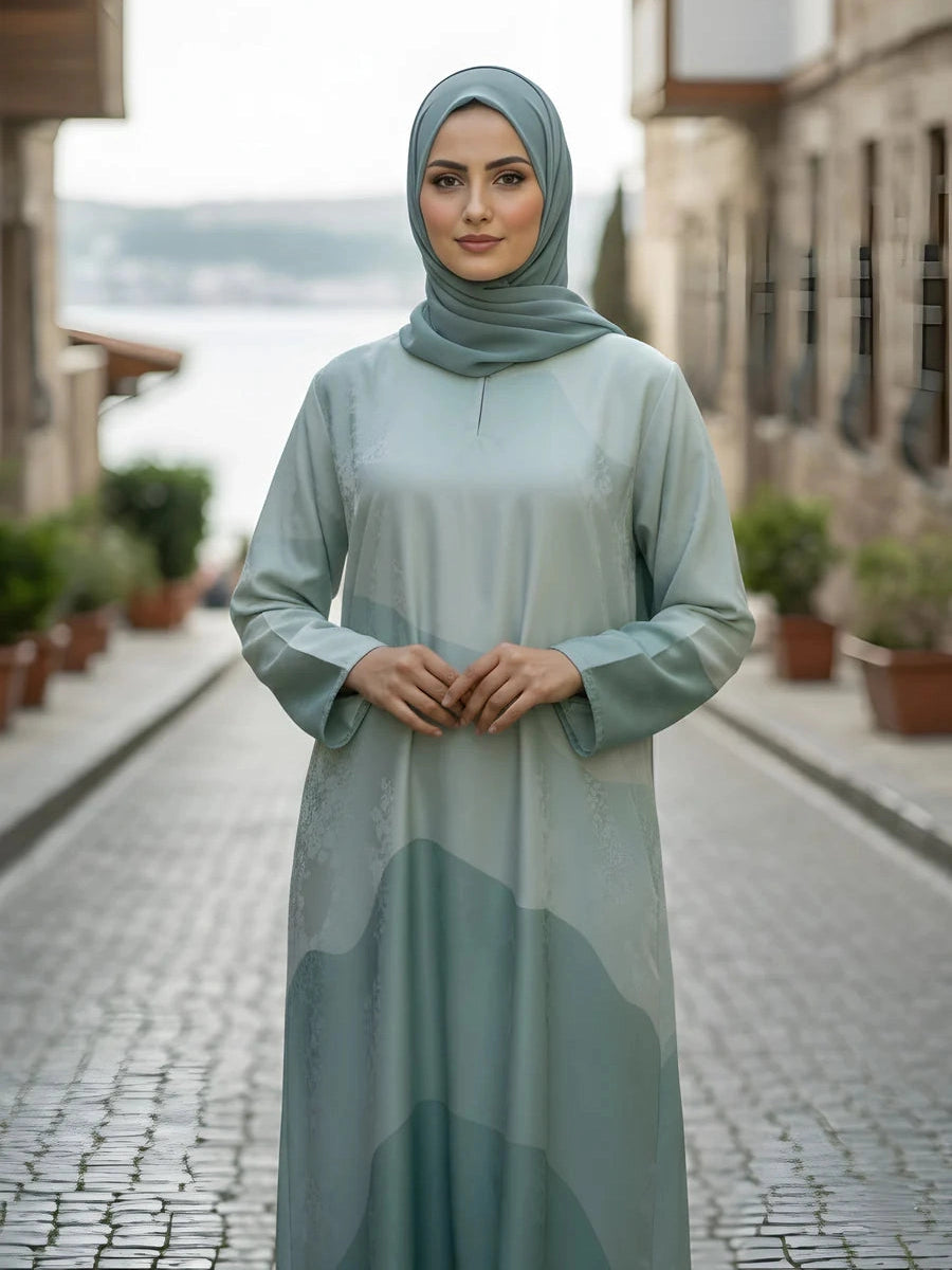 Gracefully fluid with cool-toned sophistication, this Tonal Aqua Maxi Style Abaya is a refined expression of modern modest elegance. Crafted from a softly textured fabric, the design showcases artistic tonal paneling in layered grey shades, creating depth, movement, and a naturally flowing silhouette. Its airy drape and minimalist construction make it ideal for women who appreciate calm, contemporary style with understated luxury.