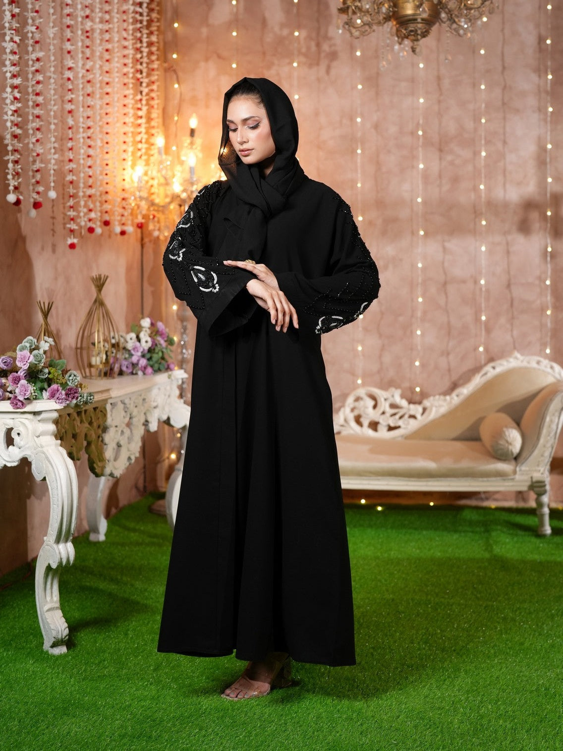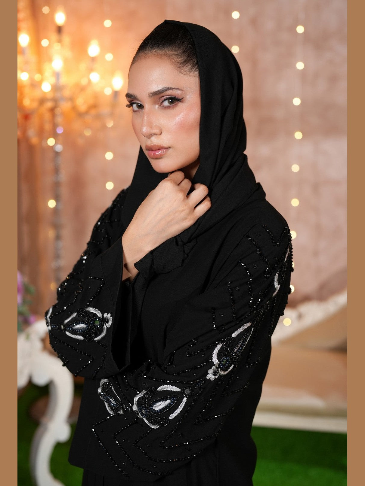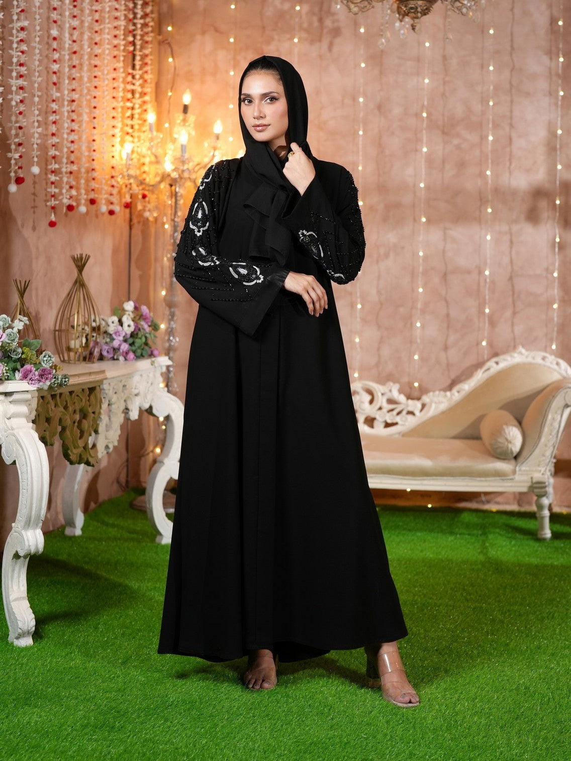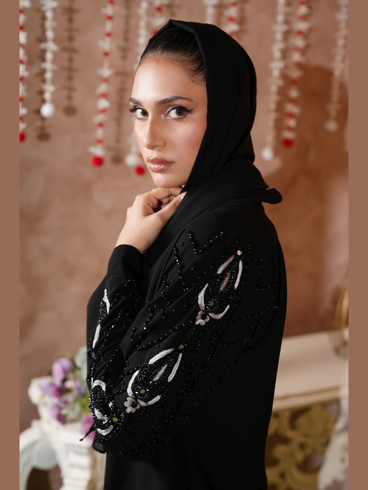The Miskeenah Abaya embodies grace, humility, and timeless elegance. Tailored from premium Nidha fabric, this stunning black abaya features hand-embellished sleeves adorned with delicate beadwork and sequin floral patterns. Its flowing silhouette and refined structure make it ideal for both formal occasions and evening gatherings, effortlessly blending modesty with sophistication.