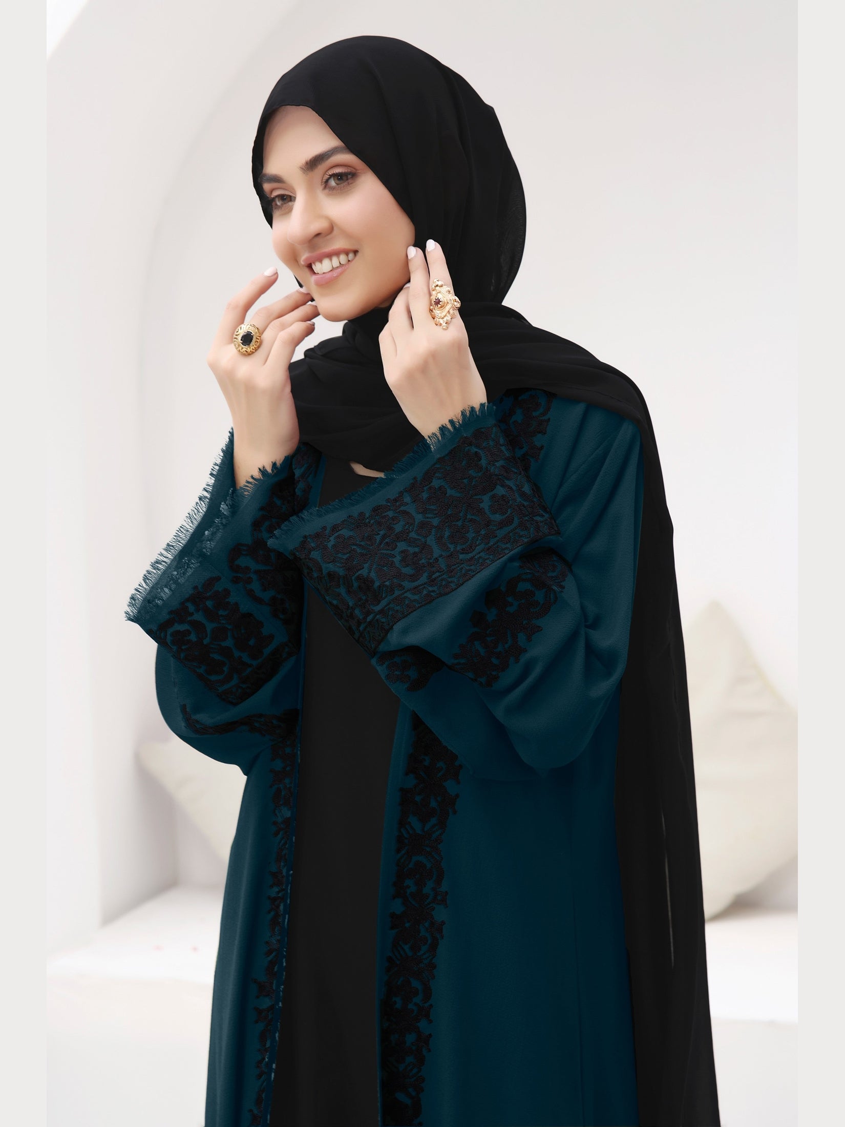 Elegant Contrasts: The rich teal and black combination enhances the abaya’s visual appeal.
