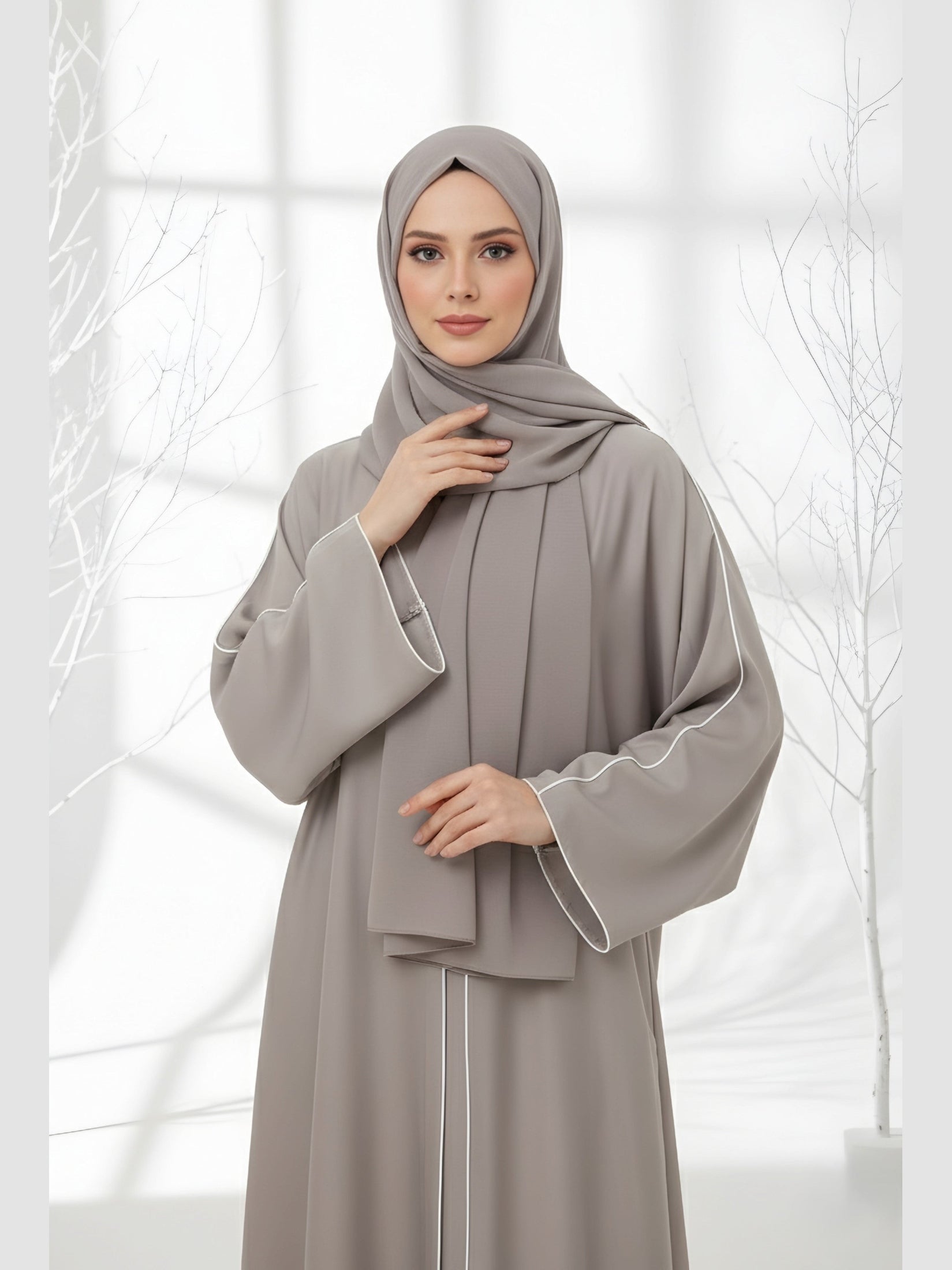 Understated elegance with a modern touch — the Sand Dust Abaya features sleek contrast piping on luxurious Nidha fabric, creating a graceful and timeless silhouette perfect for any occasion.